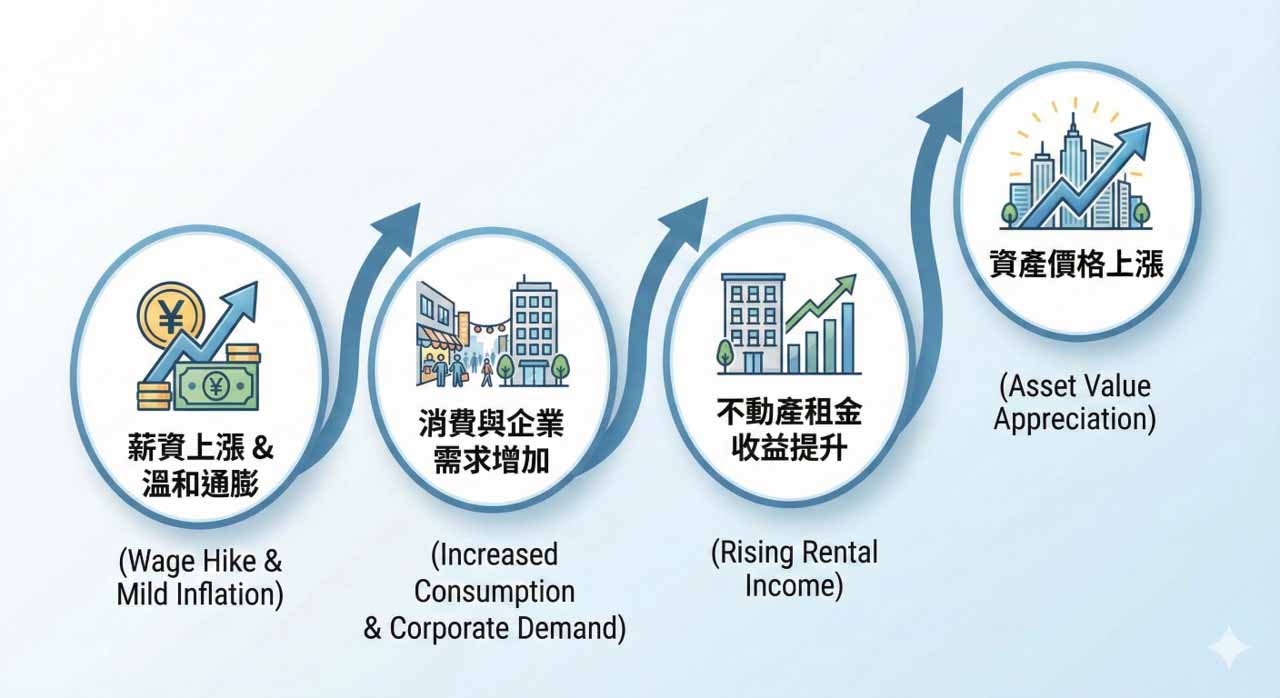 日本正處於「薪資漲 -> 消費增 -> 租金漲 -> 房價漲」的正向循環。
