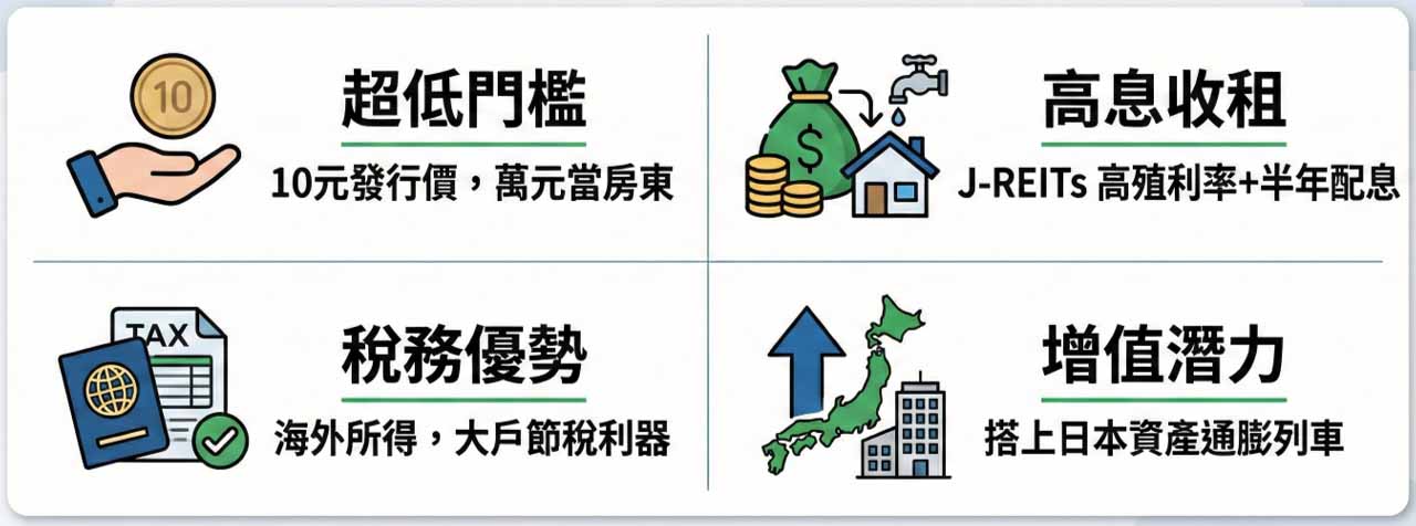 - 高殖利率:J-REITs 平均殖利率約 4.2%,優於日股大盤與許多傳統資產。