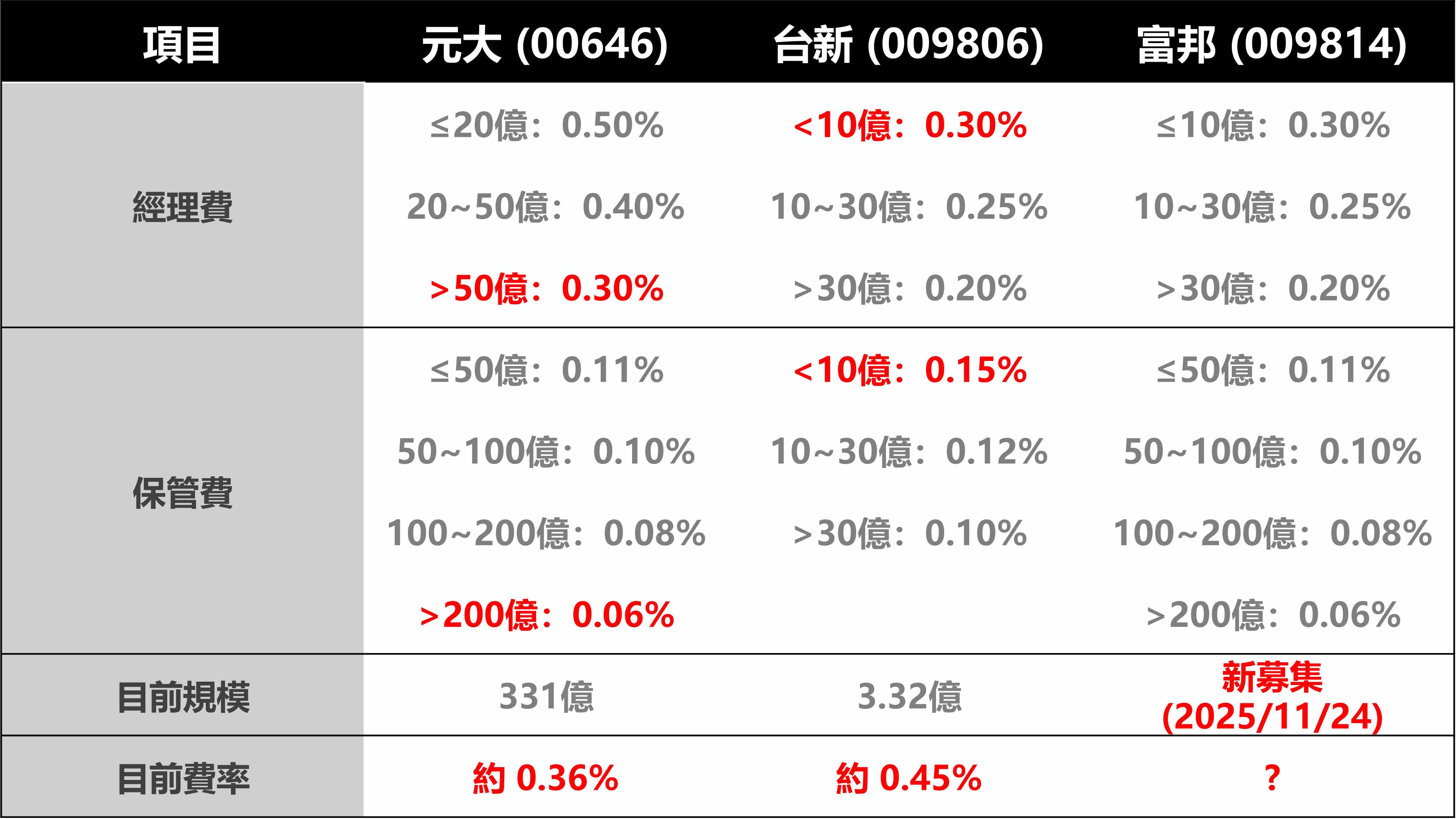 - 台新 (009806):目前規模 3.32 億,費率合計稍微高一點,為0.45%,但若突破 30 億,最低也可降至約 0.30%。