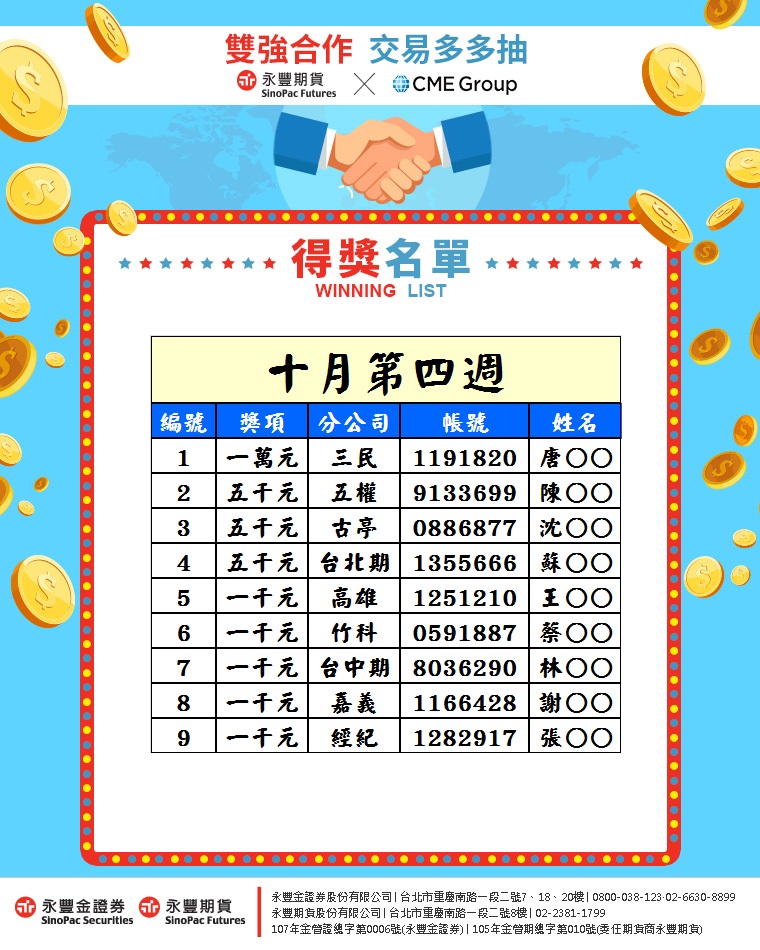10月第四週「CME雙強聯手,交易多多抽活動」得獎名單