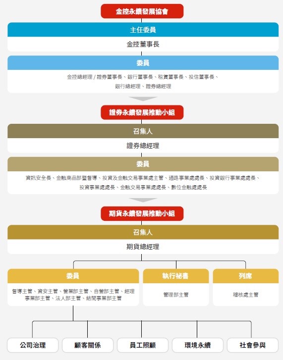 為管理本公司營運活動對經濟、環境及社會之風險與影響,永豐期貨以企業永續發展為承諾,制定「永續發展推動小組設置及運作準則」,設置永續發展推動小組,負責永續發展政策、制度及相關管理計畫之提出及執行,以落實公司治理、發展永續環境、維護社會公益、加強企業社會責任資訊揭露等四大面向,實踐企業社會責任,追求企業永續經營;永續發展推動小組每季召開會議,每季向董事會報告永續工作執行績效及規劃。永續發展推動小組每季召開會議,每季向董事會報告永續工作執行績效及規劃。2024 年因議題需要,分別於2 月21 日、4 月18 日、7 月18 日、10 月22 日共召開4 次永續發展推動小組會議,包括於2月陳報2023 年永續發展推動成果暨修正永續發展短中長期重點工作及2025 年工作計畫,於4 月、7 月、10 月陳報2024 年永續發展推動成果,均經提報董事會同意在案。本公司永續發展推動小組由總經理擔任召集人。委員由督導主管及總經理指定之主管擔任;執行秘書由管理部主管擔任,承召集人之命負責統籌推動小組相關行政事務,包括永續報告書資料整合及報告書發布。永續發展推動小組下設置公司治理、顧客關係、員工照顧、環境永續、社會參與等五個工作小組,負責訂定永續發展政策、制度及相關管理計畫並協同各單位推動永續發展相關活動。各工作小組組長由召集人指派適當人員擔任。